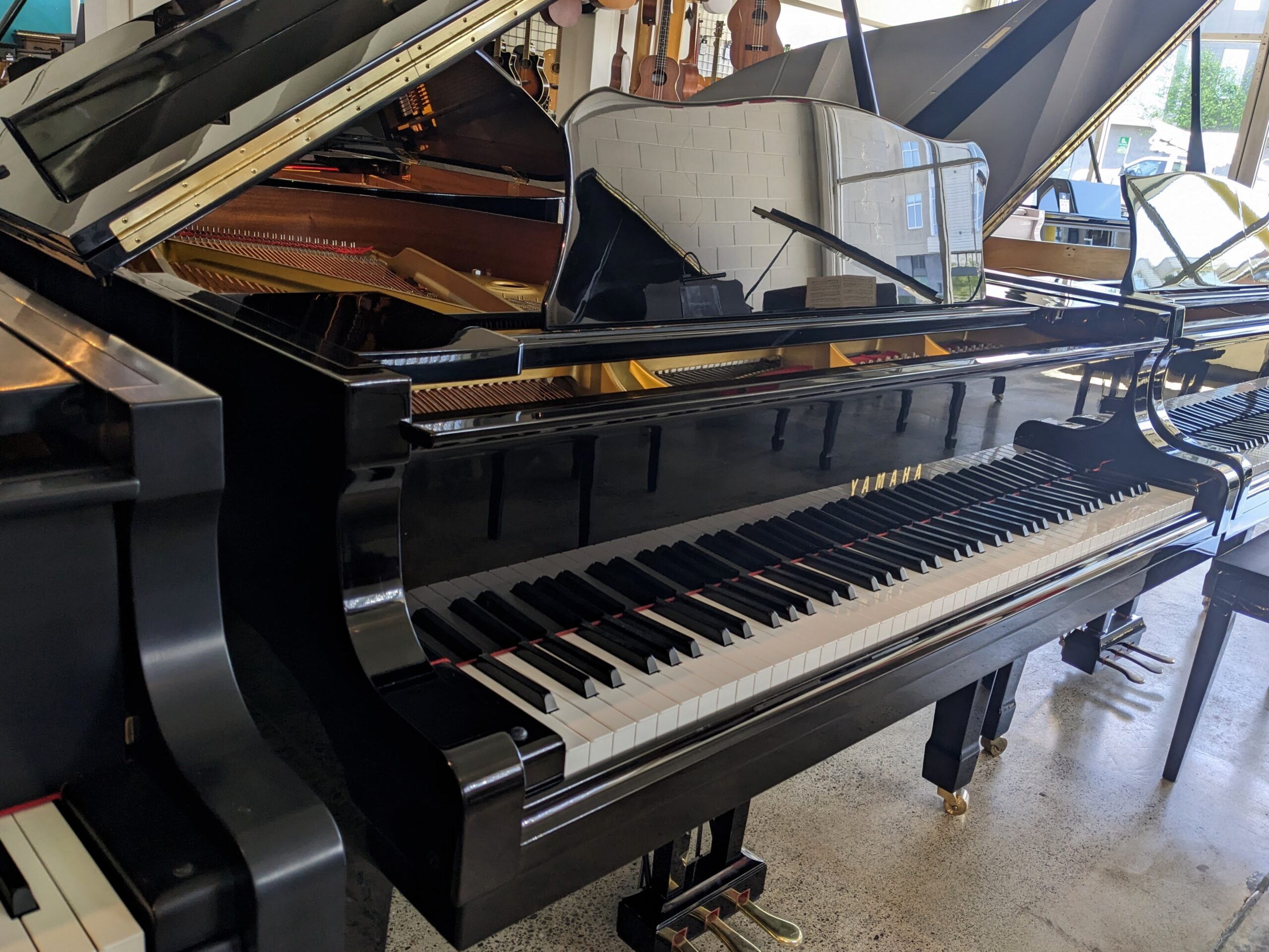This 5’8 Yamaha grand piano in a beautiful high polished ebony finish is the perfect size for both home , studio or school use. It’s 5’8 size produces a wonderfully full rich tone heard in many larger grands. The bass is deep and voluminous and the treble is clear and crisp. This piano is in great shape and has been well maintained and is sure to bring wonderful music to a home or school.